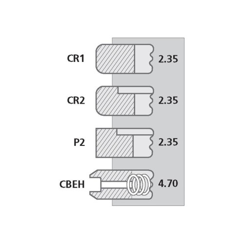 | Ringtyp | Top Ring: CR1 - Chrome Plated Barrel Faced (2.35mm) 2nd Ring: CR2 - Chrome Plated Barrel Faced Internally Stepped Top (2.35mm) 3rd Ring: P2 - Parallel Faced Internally Stepped Top (2.35mm) 4th Ring: CBEH - Chrome Plated Bevelled Edge with Helical Coil Spring (4.70mm) |