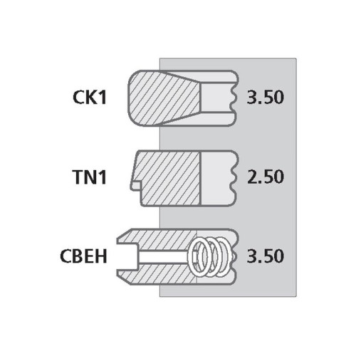 | Ringtyp | Type Thickness Top Ring CK1 - Chrome Plated Keystone 3.50mm 2nd Ring TN1 - Taper Faced Napier 2.50mm 3rd Ring CBEH - Chrome Plated Bevelled Edge with Helical Coil Spring 3.50mm |