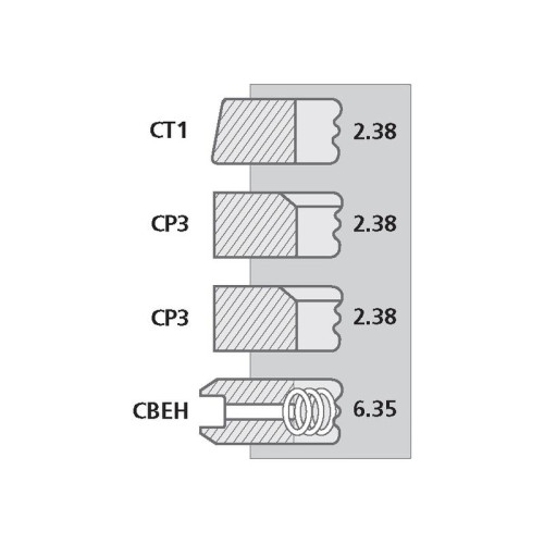 | Ringtyp | Type Thickness Top Ring CT1 - Chrome Plated Taper Faced 2.38mm 2nd Ring CP3 - Chrome Plated Parellel Faced Internally Bevelled Top 2.38mm 3rd Ring CP3 - Chrome Plated Parellel Faced Internally Bevelled Top 2.38mm 4th Ring CBEH - Chrome Plated Bevelled Edge with Helical Coil Spring 6.35mm |
