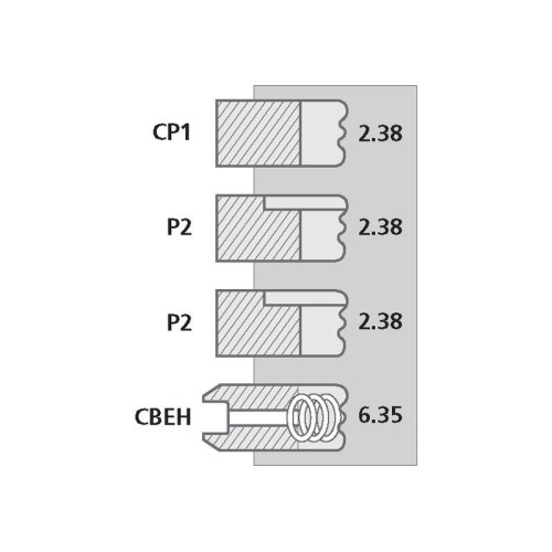 | Ringtyp | Type Thickness Top Ring CP1 - Chrome Plated Parallel Faced 2.38mm 2nd Ring P1 - Parallel Faced Plain 2.38mm 3rd Ring P2 - Parallel Faced Internally Stepped Top 2.38mm 4th Ring CBEH - Chrome Plated Bevelled Edge with Helical Coil Spring 6.35mm |