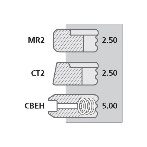 | Ringtyp | Type Thickness Top Ring MR2 - Molybdenum Plated Barrel Faced Internally Stepped Top 2.50mm 2nd Ring CT2 - Chrome Plated Taper Faced Internally Stepped Top 2.50mm 3rd Ring CBEH - Chrome Plated Bevelled Edge with Helical Coil Spring 5.00mm |
