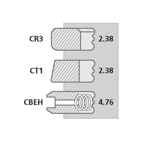 | Ringtyp | Type Thickness Top Ring CR3 - Chrome Plated Barrel Faced Internally Bevelled Top 2.38mm 2nd Ring CT1 - Chrome Plated Taper Faced 2.38mm 3rd Ring CBEH - Chrome Plated Bevelled Edge with Helical Coil Spring 4.76mm |